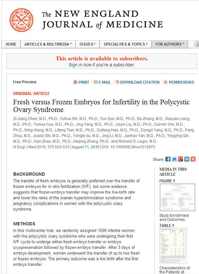 8月11日,我院首席专家陈子江教授主持的多中心临床研究成果----“多囊卵巢综合征不孕症鲜胚与冻胚移植”在《新英格兰医学杂志》发表。在国际上首次证明:与新鲜周期胚胎移植相比,胚胎冻存后移植可以明显提高新生儿活产率。这标志着多囊卵巢综合征临床治疗研究在国际上取得重大突破。