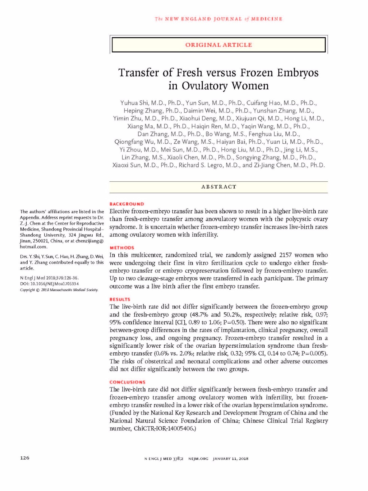 该研究由山东大学附属生殖医院、上海交通大学附属仁济医院等全国20家医院的生殖医学中心共同完成,是针对目前不孕症治疗“试管婴儿”技术在临床上应用中存在的争议和困惑,而进行的科学设计和严谨的多中心大样本随机对照试验。本研究结果提示,在有排卵的不孕症患者中实施体外受精与胚胎移植(试管婴儿)治疗中,“与鲜胚移植比较,全胚冷冻-冻胚移植的活产率及孕产期并发症无明显差异”,为不孕症的临床诊疗实践及个体化诊疗提供了进一步的高质量的循证医学证据,并为临床辅助生殖技术(试管婴儿技术)“全胚冷冻-冻胚移植策略”的患者利益最大化、治疗有效性、长期安全性评价以及个体化应用价值提供了科学依据,有望对今后的辅助生殖技术相关临床实践、临床治疗指南的修定和实施起到积极作用。